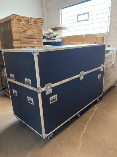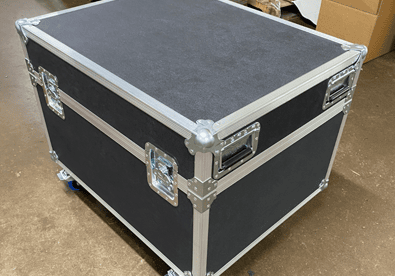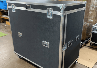 Lightweight plywood laminated with a polyethylene outer shell makes up the exterior construction of Custom Case Company’s hard shipping cases. This construction provides a solid outer shell to protect delicate or sensitive items within the case.