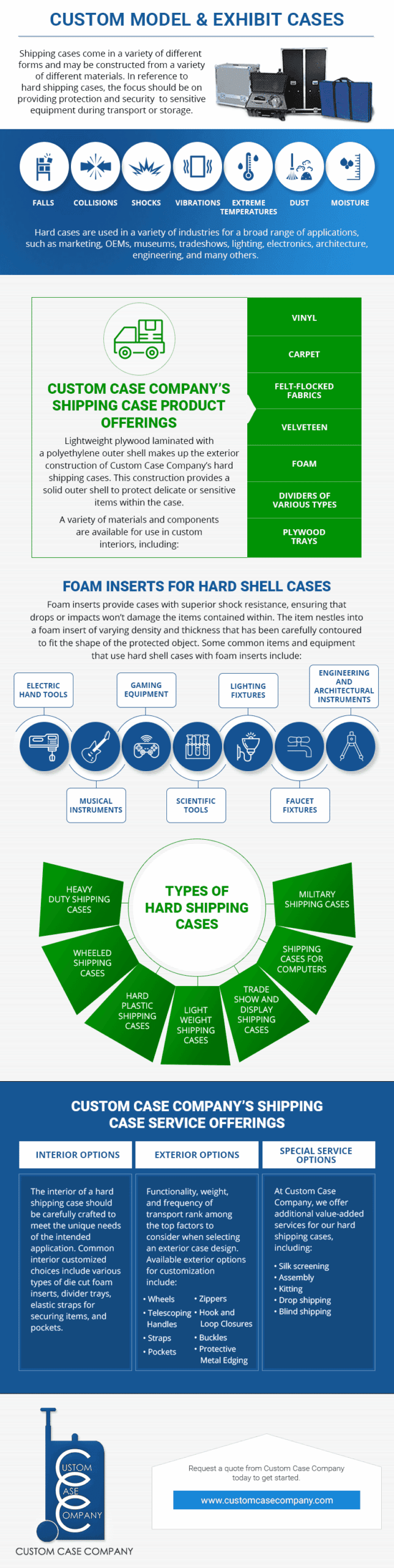 Custom case design is quite common with trade show and display shipping cases. The protected items included in these cases tend to be specialized and unique. These cases are designed specifically to resist frequent jarring from transport. They tend to include compartmentalized interiors, wheels, handles, and a wide variety of custom interior and exterior features.